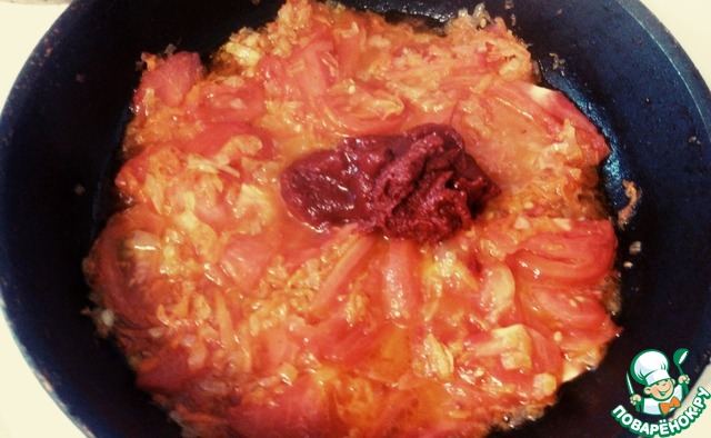 Через минуту кладем томатную пасту, если надо добавляем немного воды. Тушим пару минут, добавляем соль, сахар по вкусу.
