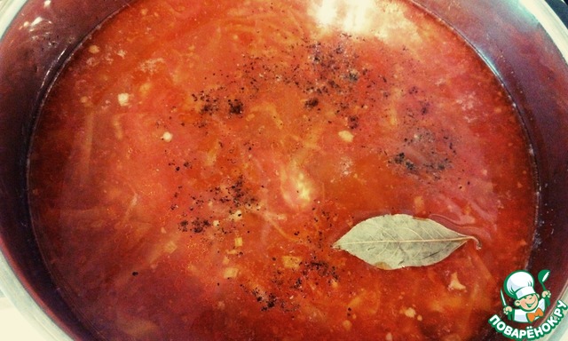 Пока мы делали зажарку капуста тоже сварилась. Добавляем зажарку, перец, лавровый лист, укроп. Доводим до кипения и все. Даем настояться минут 15 и к столу.