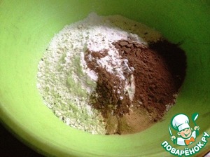 Смешать сахарный песок, муку, разрыхлитель, какао и специи. Влить медово-масляную смесь и перемешать.