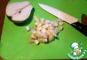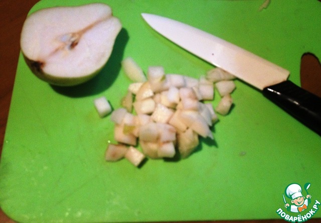 Груши вымыть, обсушить, очистить и удалить семенную коробочку. Одну нарезать кубиками, другую - ломтиками.