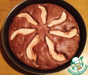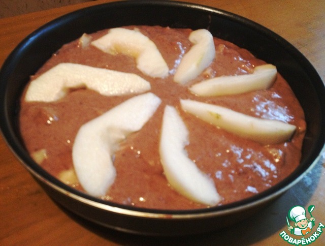Форму диаметром 22 см смазать масло, выложить тесто, на тесте разложить ломтики груш и поставить в разогретую духовку. -