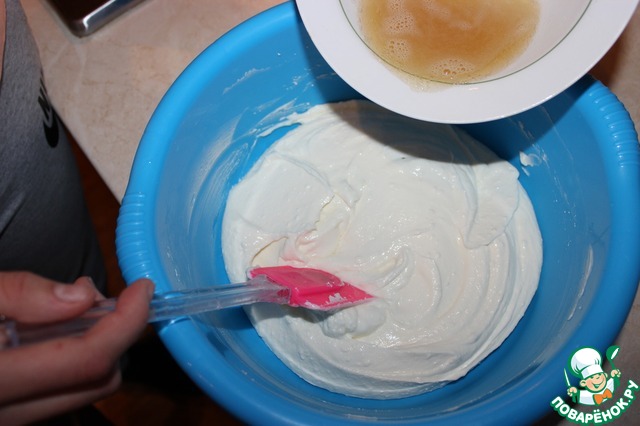 Тонкой струйкой вливать желатин в крем, быстро помешивая.