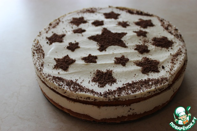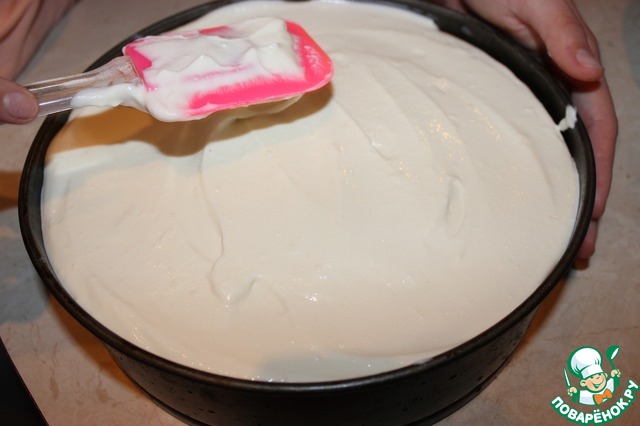 Бисквит разрезать на 2 части. На дно разъемной формы кладем часть бисквита, быстренько заливаем кремом и накрываем второй частью. Сверху покрываем торт небольшим остатком крема.