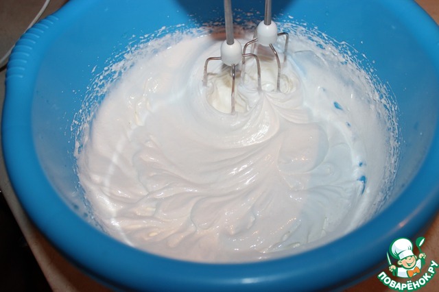 Приготовим бисквит. Для этого отделяем белки от желтков и взбиваем белки добавляя сахар.