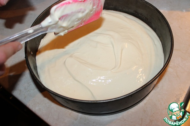 Тесто аккуратно перемешать лопаткой сверху вниз. Дно формы (у меня диаметр 24 см) застелить пергаментной бумагой или смазать маслом, бока- не нужно, так бисквит лучше поднимется.
