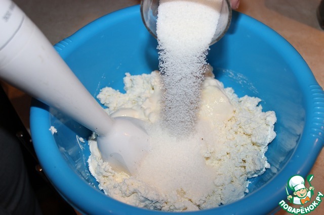 Готовим творожную начинку. Творог ( у меня зерновой) измельчаем блендером, добавив сахар и сметану, до кремообразного состояния. Сахар добавляйте на свой вкус. Так же можно добавить ванилин.