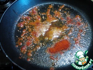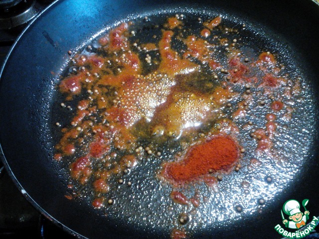 В сковороду наливаем растительное масло, нагреваем, добавляем паприку и кориандр.