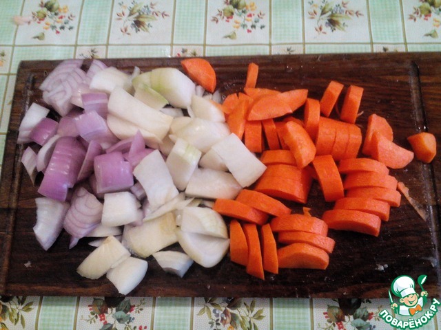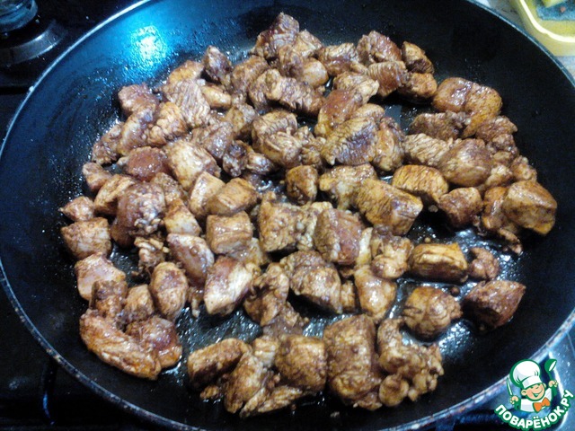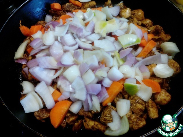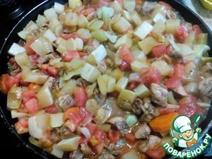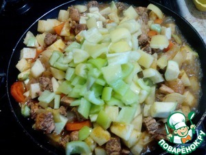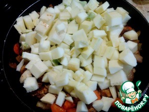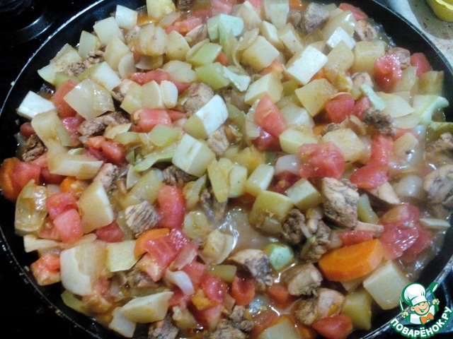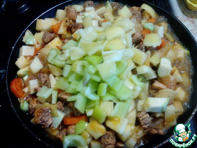 Добавляем в рагу. При необходимости добавляем еще немного воды. Снова прикроем крышкой.