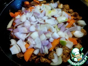Добавляем овощи к мясу, пусть пожарятся вместе 5 минут.