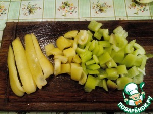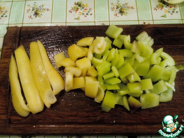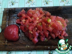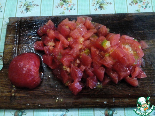 С помидора снимаем кожицу, нарезаем и отправляемых в след за перцем.