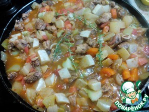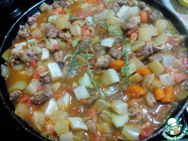 Положим сверху веточки тимьяна, досолим и поперчим по своему вкусу. Накрываем крышкой и оставляет тушиться до готовности.