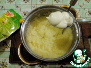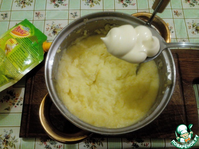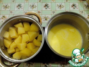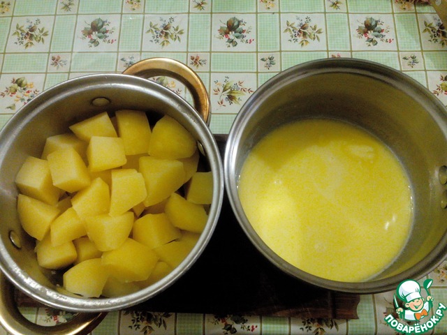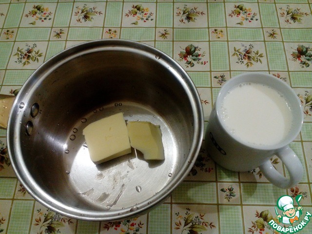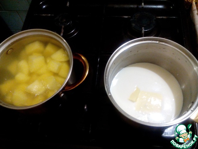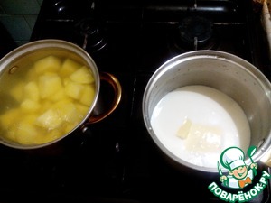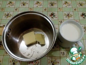 Пока вариться картофель. В кастрюльку наливаем молоко и добавляем сливочное масло. Ставим на огонь.