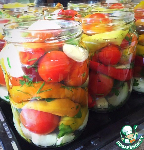 В подготовленные банки выкладываем слоями на дно зелень понемногу, лук, закладываем помидорчики, перчик, лук, чеснок, опять зелень и помидорчики.