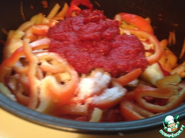 В чашу мультиварки налить растительное масло, выложить лук, затем морковь и перец. Добавить соль, сахар и томатную пасту, закрыть крышку и включить режим "Тушение". Готовить до окончания режима