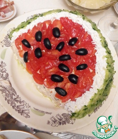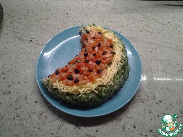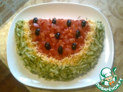 На плоской тарелке сформировать основу салата в виде арбузной дольки. Сверху украсить слоем помидоров, ближе к краю натертым сыром, самый край - тертым огурцом. Украсить кусочками маслин.
