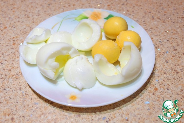 Яйца отварить. Отделить белки от желтков.