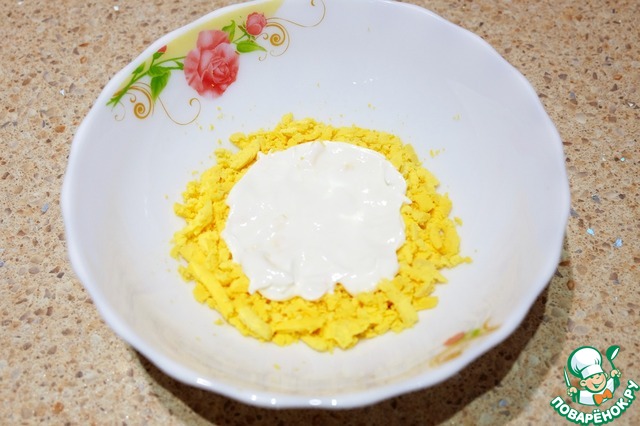 В миску выложить слой желтков, добавить тонкий слой сметаны.