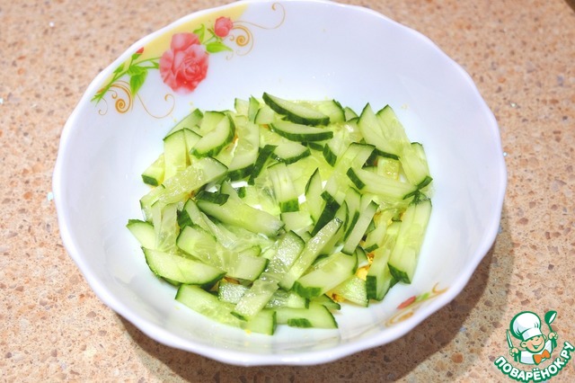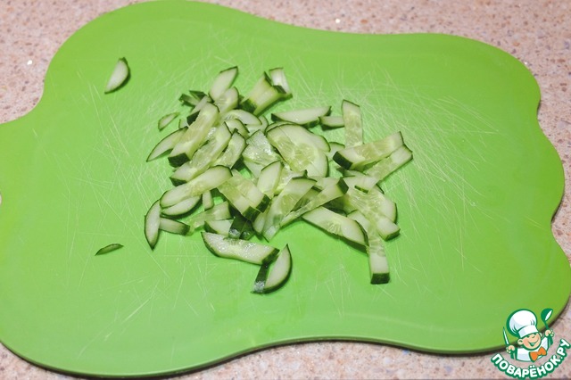 Огурцы порезать тонкой соломкой.