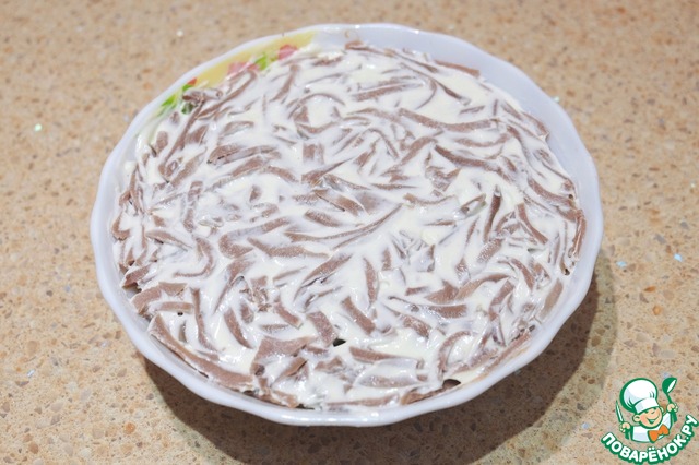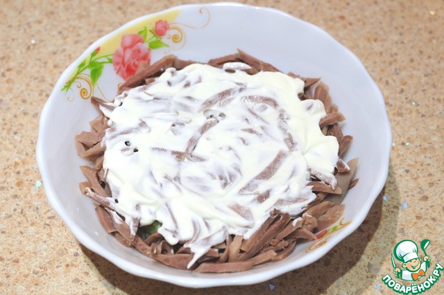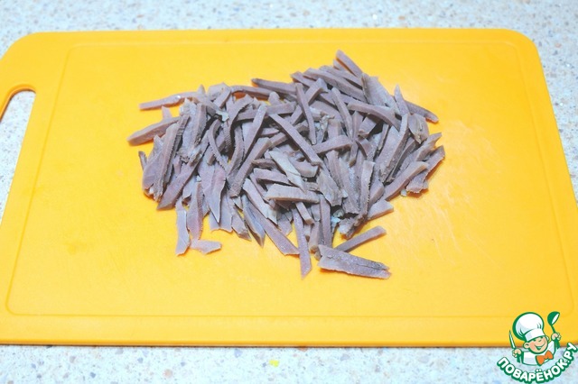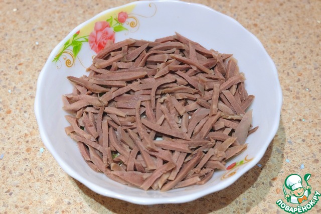 Свиные язычки отварить, удалить покровную пленку, порезать тонкой соломкой.