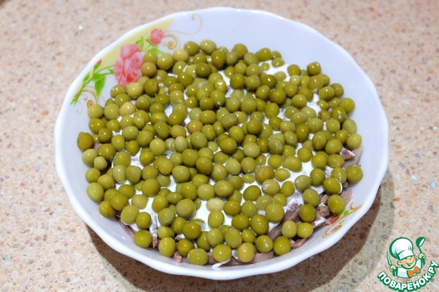 Выложить консервированный горошек.