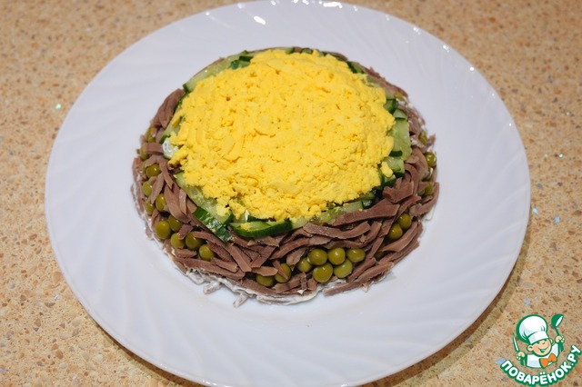 Выложить на слой сметаны огуречную соломку.