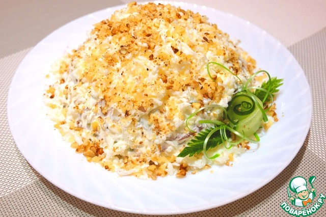 Сверху салат посыпать дробленным грецким орехом.