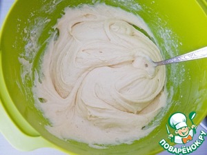 Выкладываем в тесто ПОЛОВИНУ муки, взбиваем до однородности.