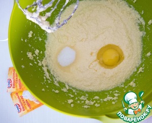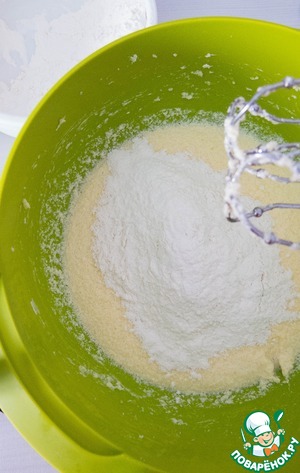 С последним яйцом добавляем ванильный сахар. Муку просеиваем и смешиваем с разрыхлителем.