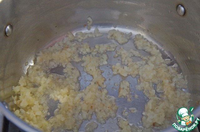 В кастрюле с толстым дном нагреть растительное масло с добавлением красного перца и поджарить на нем нарезанный лук до золотистого цвета.