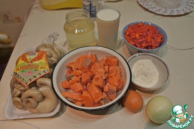 Рыбу разделать и филе нарезать кубиками, посолить, поперчить и сбрызнуть лимонным соком.