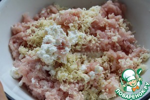 • Прокрутить через мясорубку творог с куриными грудками, добавить сыр, посолить и поперчить по вкусу.