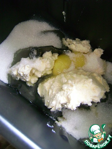 Продукты комнатной температуры выложить в ведерко хлебопечки. У меня сначала идут влажные продукты и жидкость.