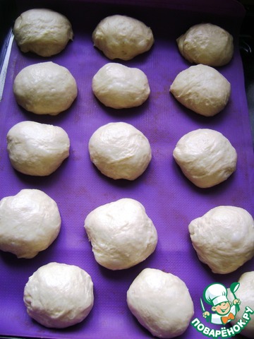 Сформовать маленькие круглые булочки, подворачивая тесто со всех сторон книзу. Выложить на лист и дать расстояться с полчаса. Я расстаивала в духовке при работающей лампочке.