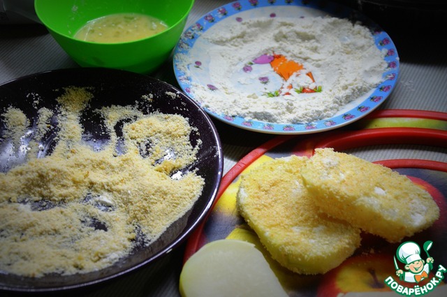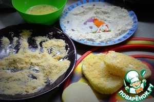 Подготовить 3 тарелки: с яйцом, мукой, панировочными сухарями со специями и обвалять кольраби в последовательности - мука, яйцо и панировка.