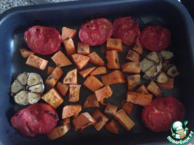 Спустя 20 минут, в моей электрической духовке, батат и чеснок стали мягким и все овощи подрумянились.