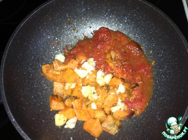 Перекладываем батат к лучку, помидоры очищаем от кожицы и добавляем к батату с луком, туда же очищенные дольки чеснока ( я использовала половину чеснока, вторую часть измельчила и вместе с растопленным маслом на хлебушек намазала).