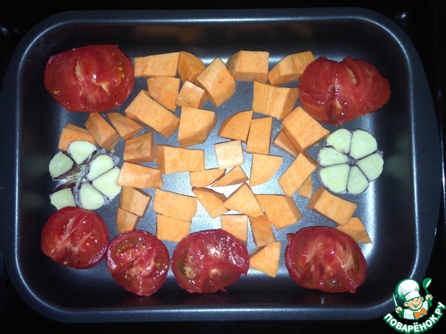 Включаем духовку на 180 градусов, пусть прогревается. А в это время чистим батат, нарезаем на кусочки. Помидорки моем, удаляем сердцевины, разрезаем на 2 части. Чеснок очищаем от внешней шелухи и разрезаем на 2 части. Складываем все в посуду для запекания и отправляем наши овощи в духовку на 10 минут при 180 градусах и потом 10 минут под грилем.