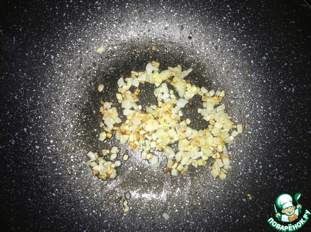 Пока овощи загорают в духовке, чистим лук, мелко режем и обжариваем его на растительном масле до золотистого цвета.