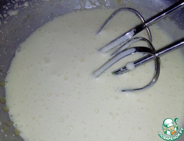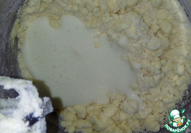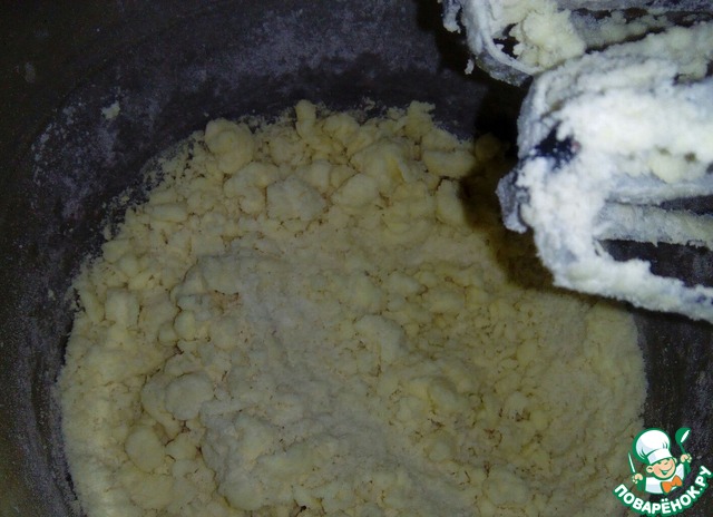 Далее в масляную крошку постепенно вливаем ранее приготовленные желтки, продолжая взбивать.