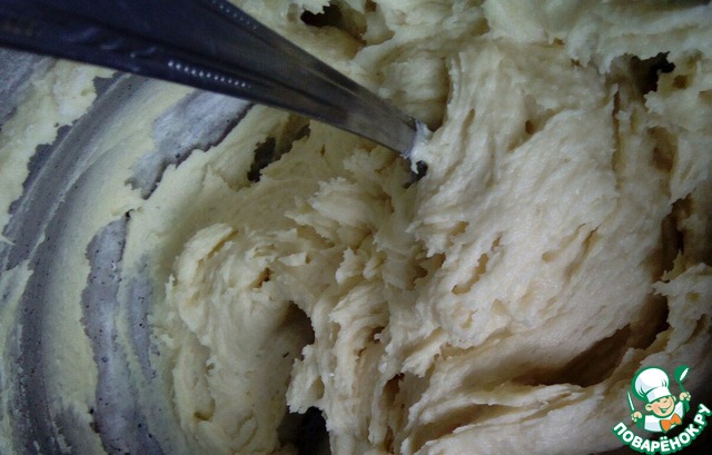 Масло комнатной температуры необходимо размять. Добавляем в него просеянную муку и разрыхлитель.