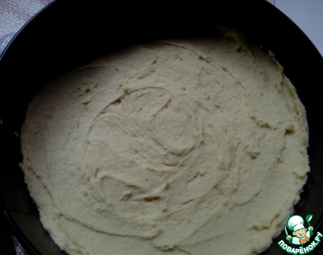 Разогреваем духовку до 200 градусов. Берем разъемную форму для выпекания, застилаем дно пергаментной бумагой. Выкладываем тесто и ровняем по форме чуть заходя на бортики. У меня тесто не липло. ( если вдруг у Вас липнет тесто, смочите ложку в воде ).