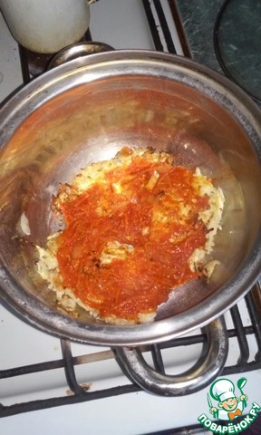 Режем лук, натираем на терке морковь ( желательно на мелкой) и готовим зажарку. Обжариваем до золота лук, добавляем морковь. Томатную пасту разбавляем кипяченой водой или томатным соком и вливаем в овощи. Тушим до загустения.