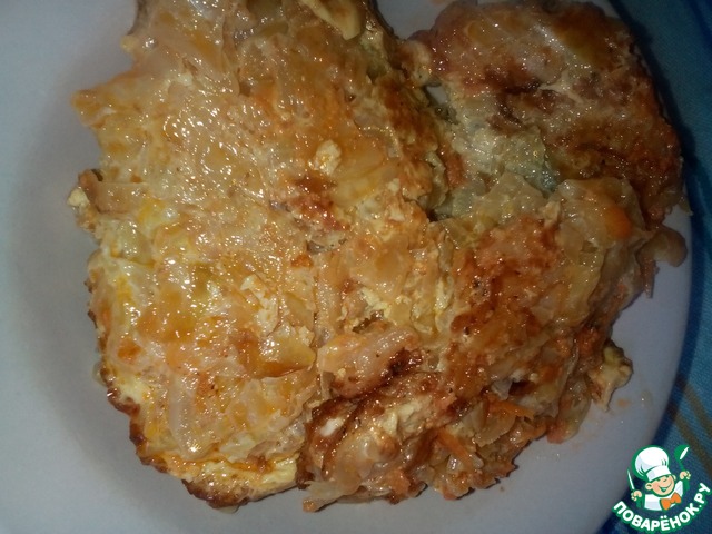 Готовые оладики складываем в кастрюльку и каждый слой обильно засыпаем нашей зажаркой.