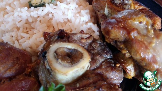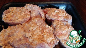 Кусочки голяшки посолить и довольно густо смазать маринадом. У меня мясо мариновалось 4 часа, но его вполне можно оставить и на ночь.