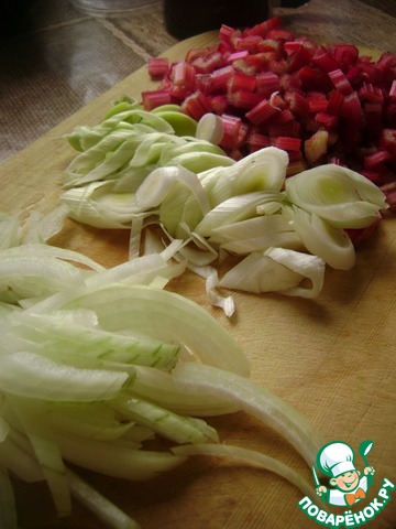 Нашинковать порей ломтиками наискосок, репчатый лук –вдоль луковицы, а мангольдовые черешки-поперек кубиками.