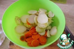Наши отваренные овощи, луковицу и половинку огурца готовим к сервировке - нарезаем по возможности кружочками