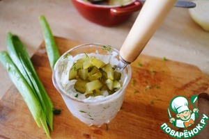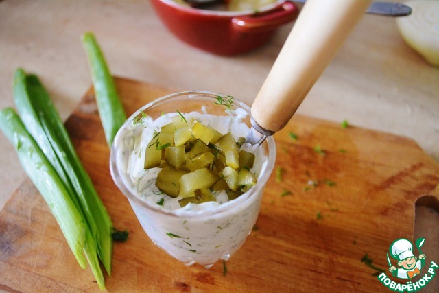 Подготовим соус: оставшуюся половину огурца мелко режем, измельчаем пару-тройку перьев лука, укроп и смешиваем все с майонезом