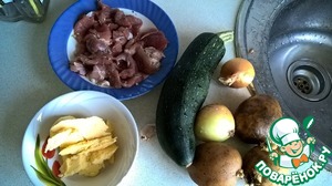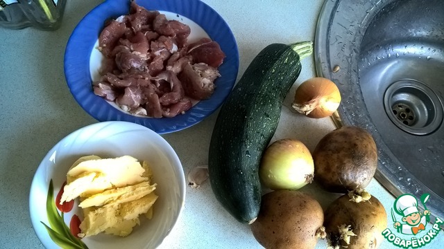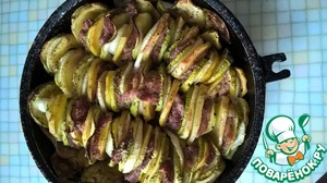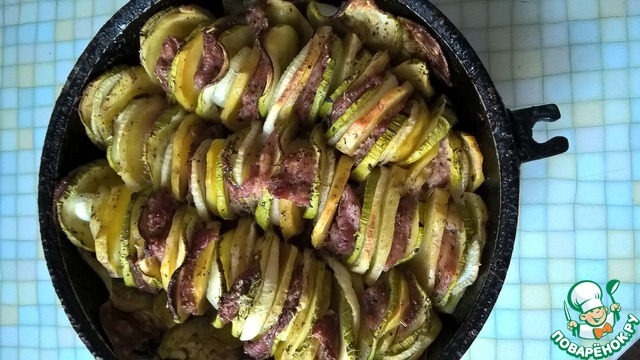 Раскладываем все ингридиенты друг за другом: картошка-лук-кабачок -мясо в жаропрочную форму или сковороду. Солим, посыпаем любимой приправой (у меня прованские травы) и зеленью. Сверху маленькой струйкой поливаем растопленным сливочным маслом.