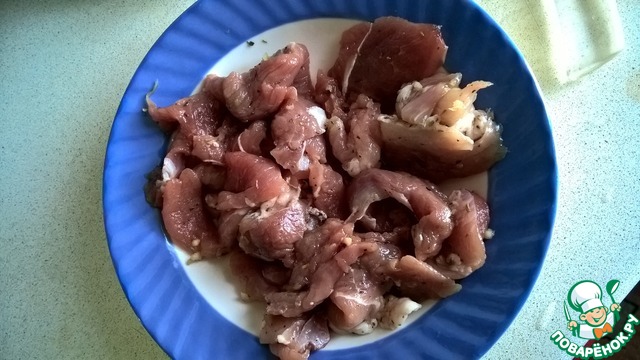 Сначала нужно замариновать мясо. Режем на тонкие плоские кусочки шириной 0.5см, солим, добавляем раздавленный зубчик чеснока и посыпаем любимой приправой для мяса.