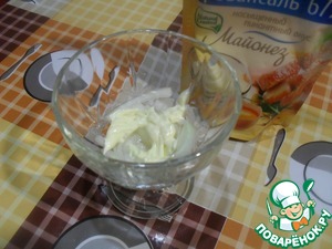 Теперь очередь дошла до сырка, трем его так же на крупной терке и добавляем майонез.